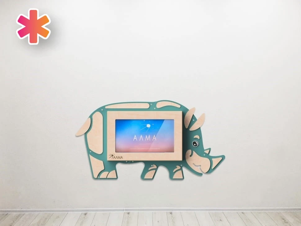 Настенная панель «Носорог» со встроенной интерактивной сенсорной панелью 32 дюйма. Это одновременно декоративное оформление стен и развивающая игрушка, ведь на панели установлен пакет игрового и обучающего ПО.