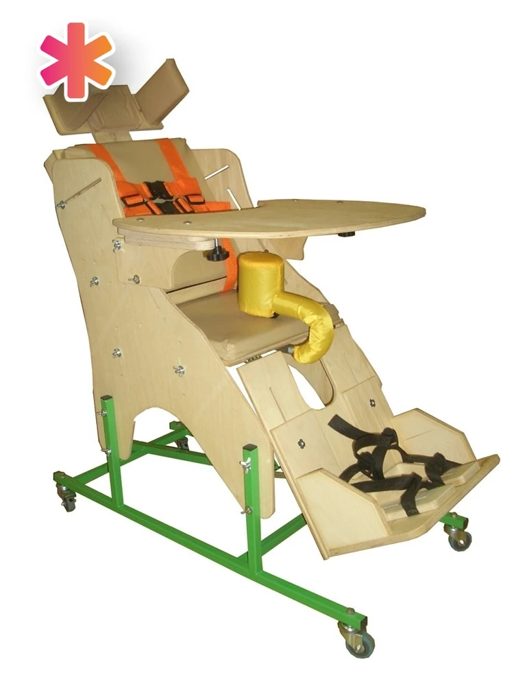 Кресло оснащено съемным столиком, который крепится на подлокотники, а также съемным регулируемым подголовником. Отличительной особенностью является то, что оно разработано и предназначено для реабилитационных мероприятий с детьми с ограниченными возможностями, включая патологии различной степени тяжести, такие как ДЦП.