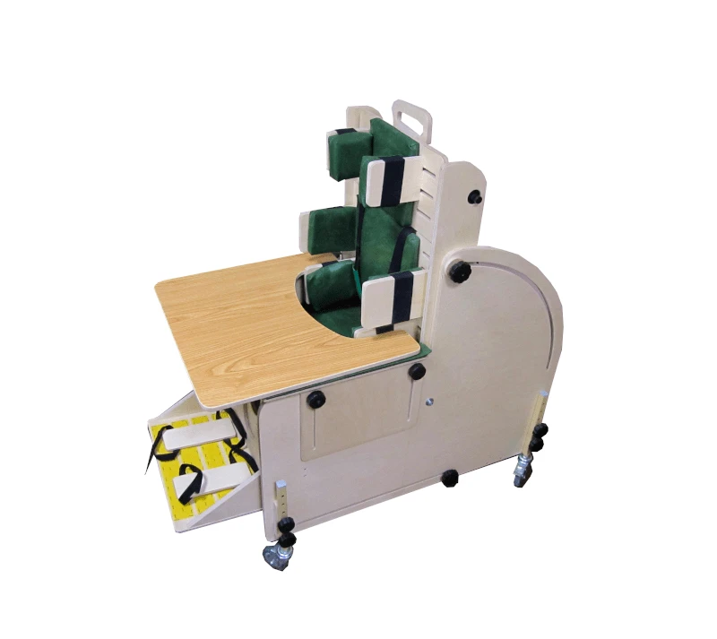Имеет съёмный столик, подножку, регулируемую до горизонтального положения и фиксаторы стоп. Опора снабжена съемным подголовником, регулируемым по высоте и съемным жилетом для поддержки и фиксации туловища. Угол наклона спинки изменяется от 90 градусов до горизонтального. В комплект входит набор креплений для фиксации торса. Опора легко трансформируется из опоры для сидения в опору для положения лежа. Ножки, съемные подлокотники, регулируются по высоте. Мягкие элементы из поролона, обтянуты искусственной кожей. Опора на колесиках задняя пара колес имеет тормоза.