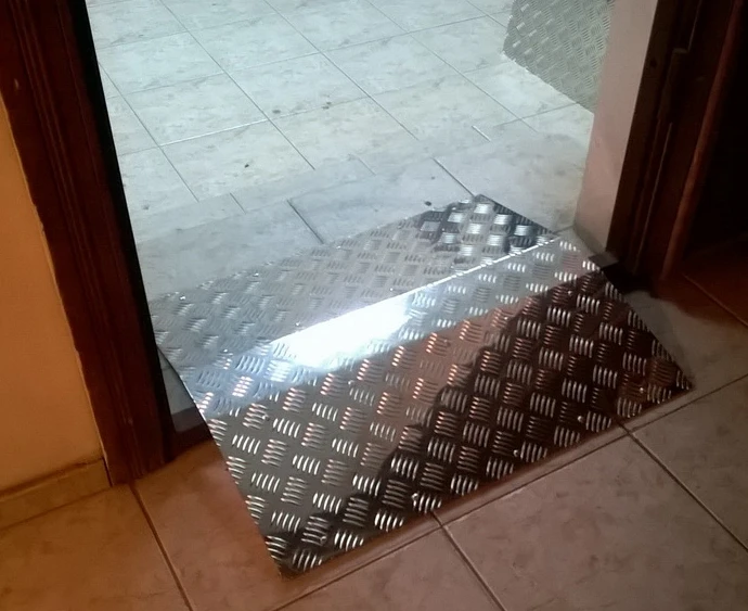 Плюс такой модели пандуса в том, что он незначительно прогибается и его можно адаптировать под разные пороги. Можно один пандус переносить с места на место. Минус такого пандуса в том, что дверь с ним не закроется.