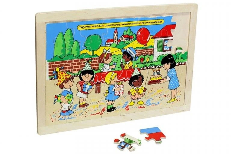 Пазл состоит из 40 фанерных деталей, из которых собирается панно размером 40х27 см, которые выкладываются на деревянной основе. Пазл «День рождения» предназначен для детей от 3 до 6-7 лет.