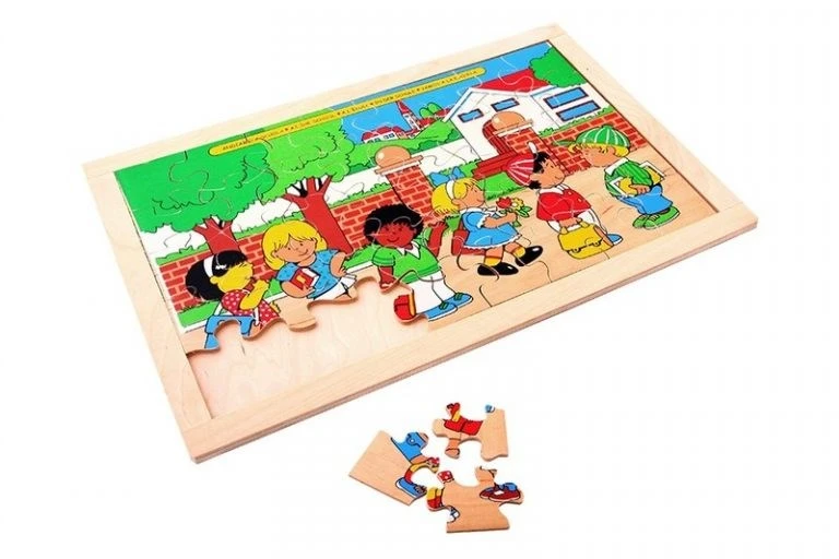 Пазл состоит из 40 фанерных деталей, из которых собирается панно размером 40х27 см, которые выкладываются на деревянной основе. Пазл «Школа» предназначен для детей от 3 до 6-7 лет.