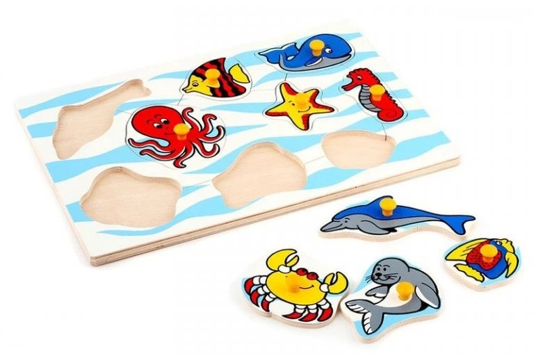 Игровое пособие представляет собой деревянный планшет размером 29,5х20,5 см, изображающий четырех забавных пчелок (вкладыши) вокруг гнезда, висящего на ветке дерева. Для удобства использования и стимуляции развития мелкой моторики вкладыши снабжены ручками-кнопочками.