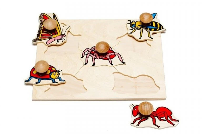 Доска-вкладыш представляет собой деревянную панель и 5 разных картинок, на которых изображены насекомые, каждая из которых снабжена удобной ручкой. Пособие развивает и тренирует мелкую моторику, внимание, формирует элементарные счетные умения и пространственные ориентировки (слева, справа, в центре).