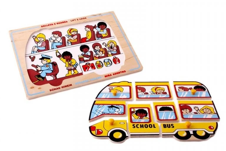 Деревянная картинка размером 29,5х20,5 см, на которой изображен школьный автобус, состоит из 9 элементов, четыре из которых снабжены удобными ручками. Под вкладышами нарисован внутренний вид салона школьного автобуса. Головоломка позволяет «снять» боковую часть кузова, а при сборке ориентироваться на стекла машин, рисунок которых частично дублирует внутреннее изображение.
