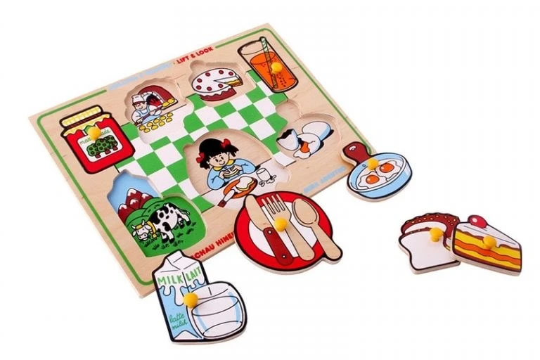 Игрушка «Фрукты, овощи. Завтрак» состоит из деревянной основы и 7 вкладышей (с ручками), на которых изображены продукты, под которыми нарисовано то, из чего они сделаны. Занятия с этой игрушкой развивают мелкую моторику, внимание и наблюдательность, развивают логическое мышление, формируют и уточняют представления о взаимосвязях, существующих между предметами, и все это сопровождается тренировкой коммуникативных умений.