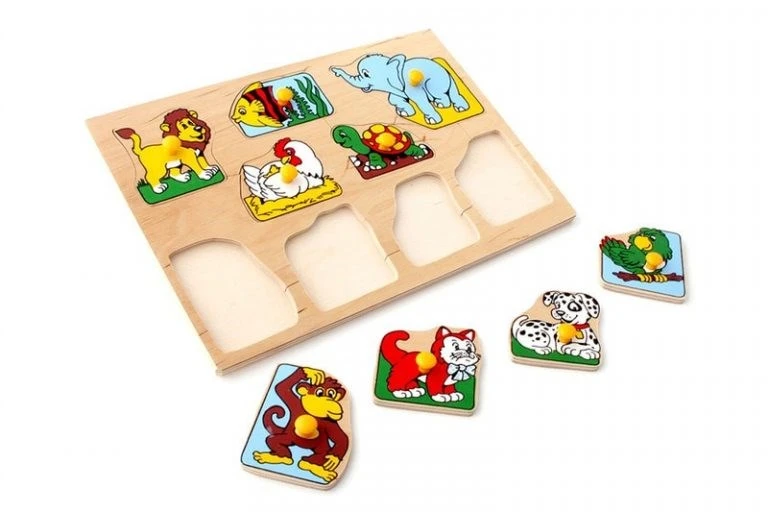 Пособие представляет собой деревянный планшет размером 29,5х20,5 см с 9 изображениями животных на вкладышах, на которых крепятся ручки-кнопки. Игры с животными развивают знания ребенка об окружающем мире, формируют коммуникативные навыки и умения, развивают и обогащают лексический запас ребенка, способствуют формированию связности его речи.