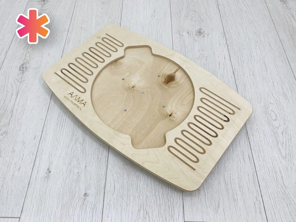 Это игровой тренажёр, улучшающий работу мозга через тренировку всего тела. Состоит из прямоугольной доски, закреплённой на неустойчивом основании в виде полусферы. В зоне ног ребристая змейка и противоскользящее покрытие. В центре балансира углубление под вставку-лабиринт. Её можно заказать отдельно.