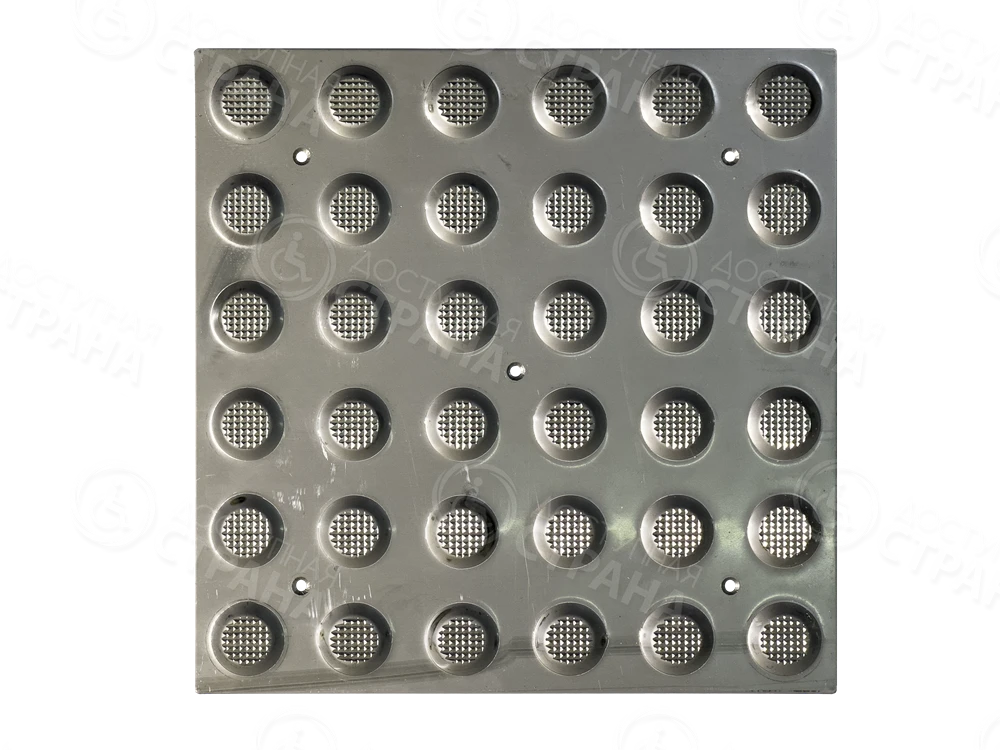 Тактильная плитка тротуарная, для помещений с высокой проходимостью (нержавеющая сталь, 300х300х5 мм, конусообразные (л) рифы)
