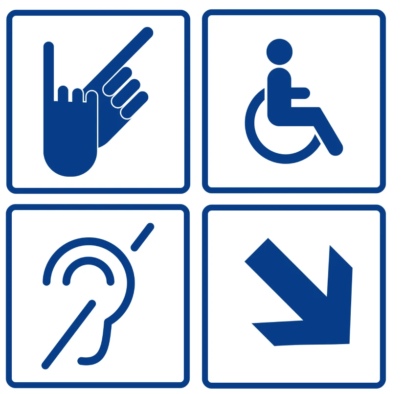 - Знаки доступности, предупреждающие и информационные знаки и пиктограммы, указатели направления движения, тактильные номера