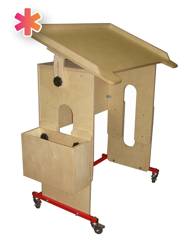 Стол-парта используется для занятий с детьми, имеющими ограниченные возможности здоровья. Имеет колесную основу, высота и угол наклона столешницы регулируется. Материал – натуральное дерево.