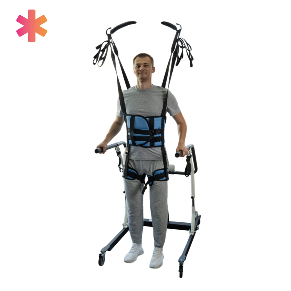 Подвесная реабилитационная система для вертикализации пациента и восстановления навыков ходьбы представляет собой мобильный подъемник, разработанный для облегчения физической нагрузки и повышения эффективности реабилитационного процесса. Она создана для снижения риска падений и уменьшения нагрузки на опорно-двигательную систему пациента, одновременно оказывая необходимую поддержку для сохранения равновесия и укрепления мышечной силы нижних конечностей.