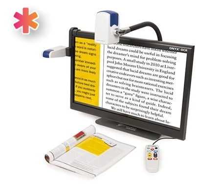 ONYX OCR - это видеоувеличитель для пользователей, которые хотят совмещать увеличение и речь. Автономный дизайн объединяет две камеры и 24-дюймовый сенсорный экран. Он позволяет просматривать полную страницу формата Letter на экране и увеличивать материалы до 131 крат.
