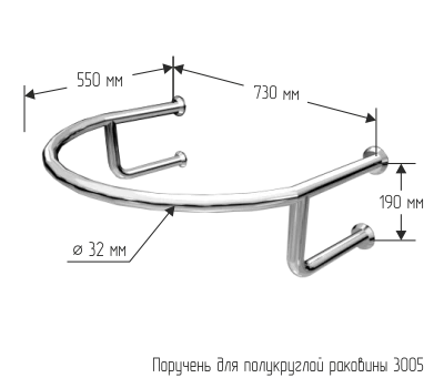 Поручень для полукруглой раковины настенный 190х730х550мм позволит инвалидам не ощущать дискомфорта даже при наличии полукруглого умывальника в ванной комнате. Диаметр 30мм. Материал изготовления – нержавеющая полированная сталь, обеспечивающая долговечность, надежность, защиту от коррозии и безопасность для организма пользователя.