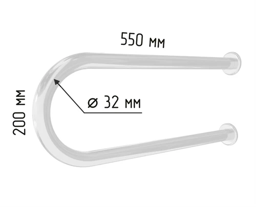 Ответ: Это стационарный U-образный поручень длиной 550 мм и высотой около 230-250 мм, предназначенный для установки возле раковины, обеспечивающий поддержку людям с ограниченными возможностями.