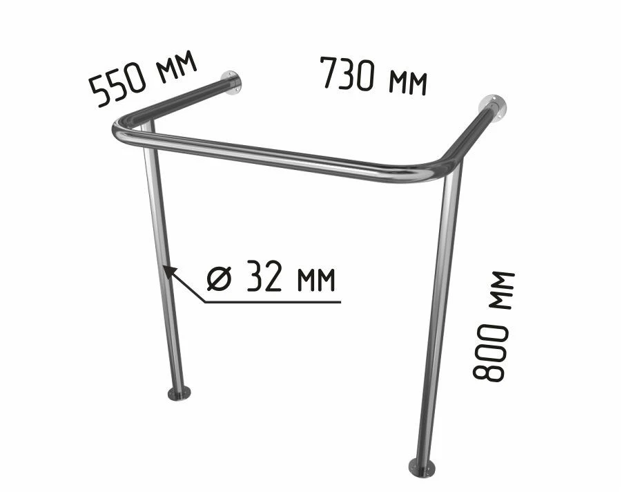 Поручень на стойках для раковины 550х730х800мм, оснащен четырьмя опорами, 2 из которых размещены на полу, а остальные прикреплены к стенке.