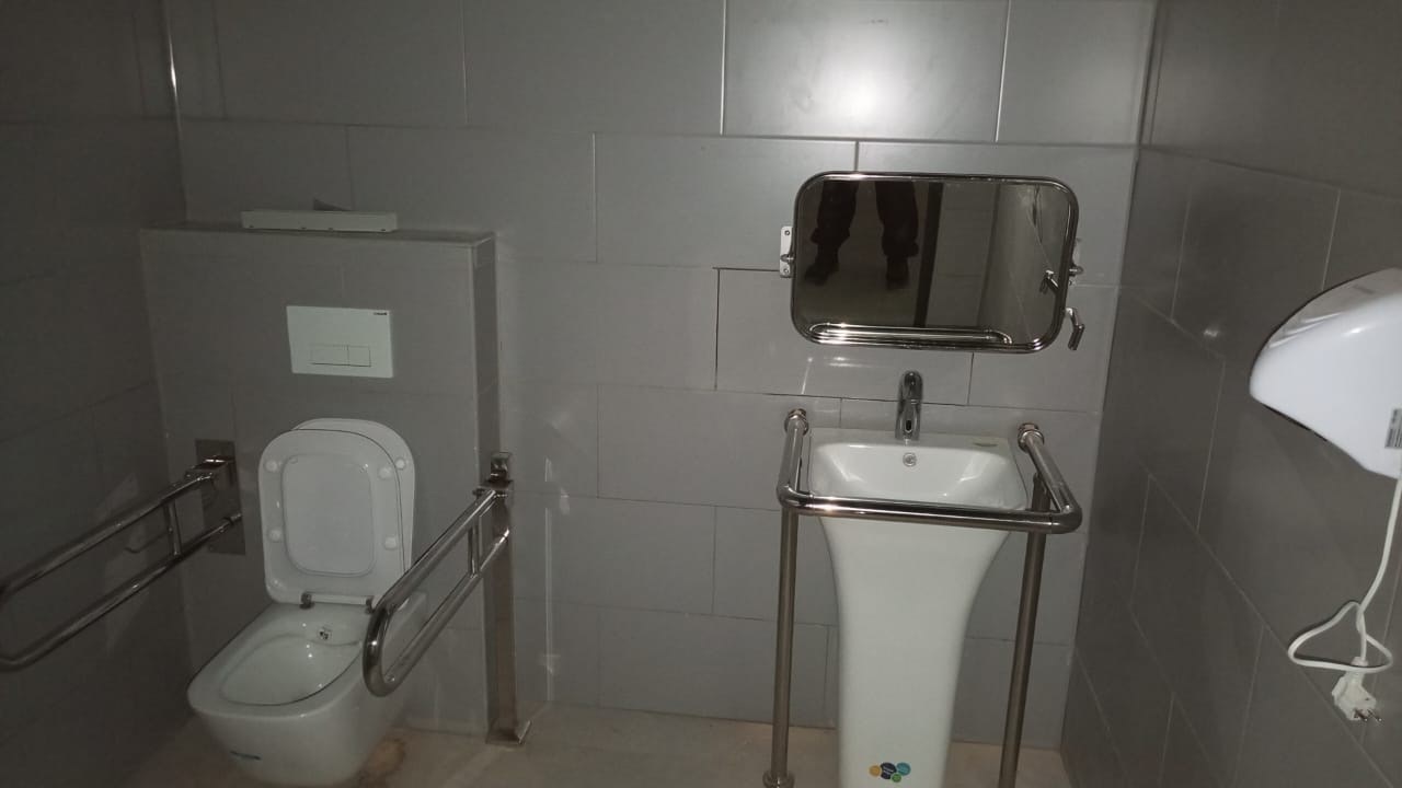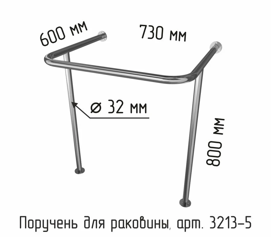 Поручень на стойках для раковины с увеличенной высотой 600х730х800мм, оснащен четырьмя опорами, 2 из которых размещены на полу, а остальные прикреплены к стенке. Опора произведена из качественной нержавеющей полированной стали.