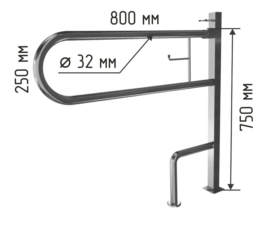 Поручень откидной на стойке (с бумагодержателем) обеспечивает максимальный комфорт для людей-инвалидов с ограничением физической активности. Опора имеет достаточное количество креплений для обеспечения безопасности и надежности. Новое крепление с пластиковыми вставками, подушками и подложками препятствует расшатыванию откидного механизма, что значительно увеличивает срок эксплуатации оборудования Поручень предпочтительно устанавливается в небольшом туалете, где нет много места для громоздких конструкций.