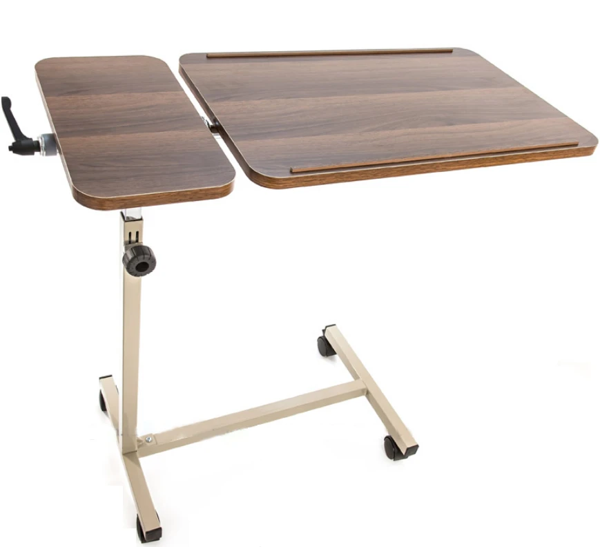 Конструкция столика рассчитана на его применение над кроватью. Основание стола заезжает под кровать, а столешница располагается сверху над лежащим. Подойдет для ухода за больными в медицинских учреждениях или дома, позволяет с комфортом проводить лечебные процедуры, принимать лекарства и пищу.Столик оборудован двойной столешницей. У большой части столешницы можно отрегулировать угол наклона; малая часть остается неподвижной. Бортики по краям столешницы предохраняют предметы от падений со стола. С помощью винта на опорной ноге конструкции у столика регулируется высота.