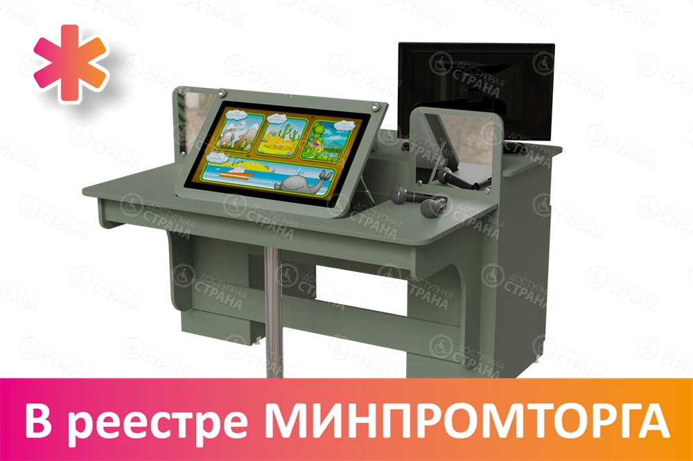 - Рабочее место для двух учеников. Оснащается 2-мя радиомикрофонами, встроенной интерактивной системой, 2-мя зеркалами для отработки логопедических упражнений. Также в модуле предусмотрен монитор диагональю 25”, который оснащен 2-мя механизмами с газовыми пружинами и гидравлическими амортизаторами и может поднимать или опускаться в зависимости от потребности в его использовании.