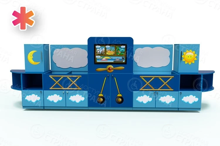 Комплекс «Логопедический Самолет» достаточно большой, размером 1516 х 3111 х 500 мм. Изготовлен из ламинированной ДСП. Оснащен: