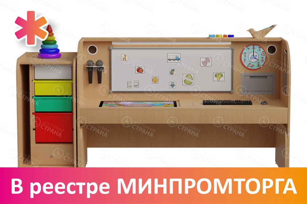 В комплекс дополнительно входя маркеры, магниты, поощрительные наклейки, наборы для развивающих материалов, дидактические пособия для педагогов и т.д. В стол встроено логопедическое зеркало, магнитно-маркерная доска, модульный стеллаж, 2 микрофона, интерактивный планшет диагональю в 25 дюймов. Предусмотрена индукционная система для усиления звука для слабослышащих. Установлено программное обеспечение PROTECT KIDS для безопасности детей в компьютерной среде.
