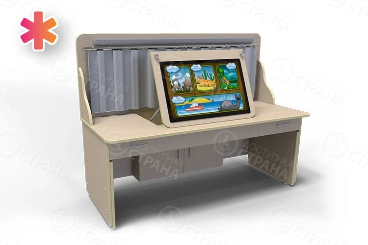За счет регулировки высоты стол подходит для работы с детьми от 3 до 14 лет с нормальным развитием или с ОВЗ, ОНР. Его корпус выполнен из ламинированной ДСП, которая безопасна для малышей, так как не выделяет токсичных веществ. Комплекс оборудован зеркалом размером 1180х390 мм и двумя занавесами для него.