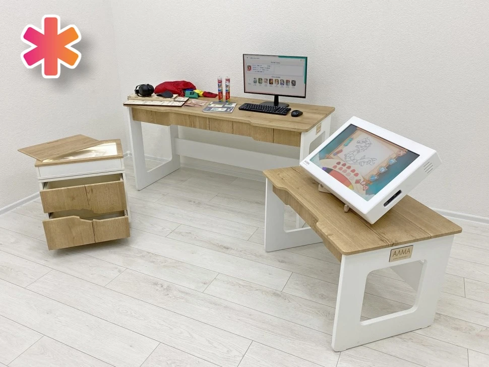«АЛМА ПРО» – это профессиональный стол для кабинета детского психолога-дефектолога. В комплекте традиционные методики, настольные коррекционные игры и специализированное ПО. Стол служит постоянным рабочим местом для специалиста психолога-дефектолога.