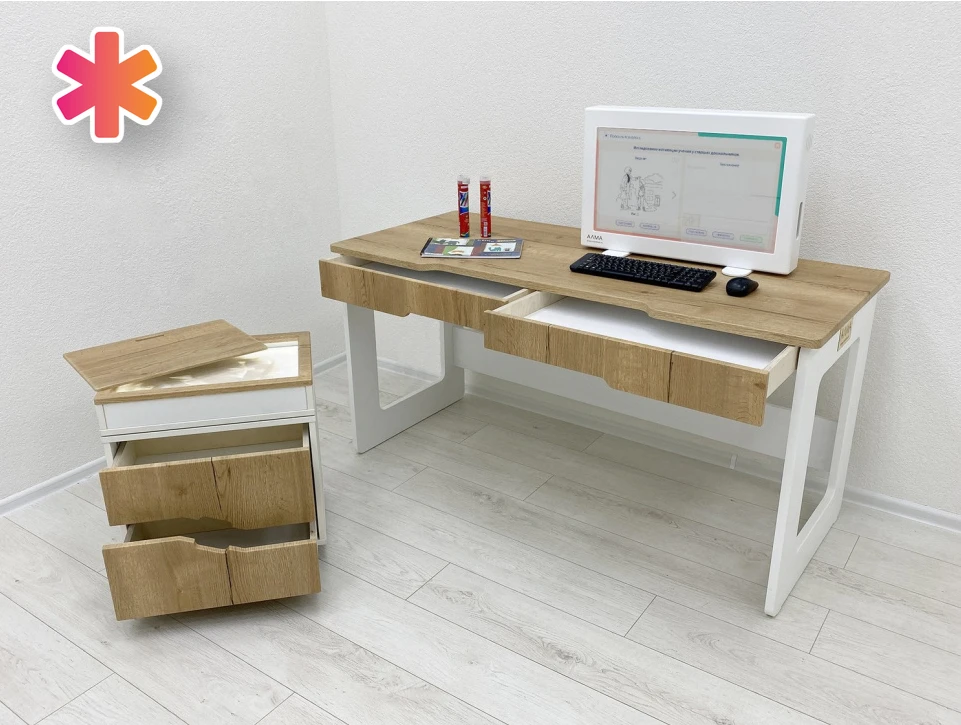 Профессиональный стол для кабинета психолога-дефектолога. В комплекте традиционные методики, настольные коррекционные игры и широкий спектр специализированного ПО. Стол служит постоянным рабочим местом для специалиста, а профессиональные программы позволяют расширить рамки взаимодействия педагога и ребенка. Благодаря интерактивным играм на сенсорном экране дети активно участвуют в процессе.