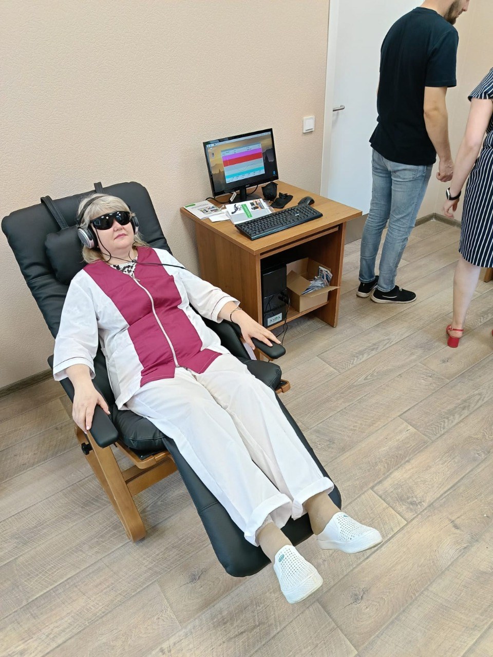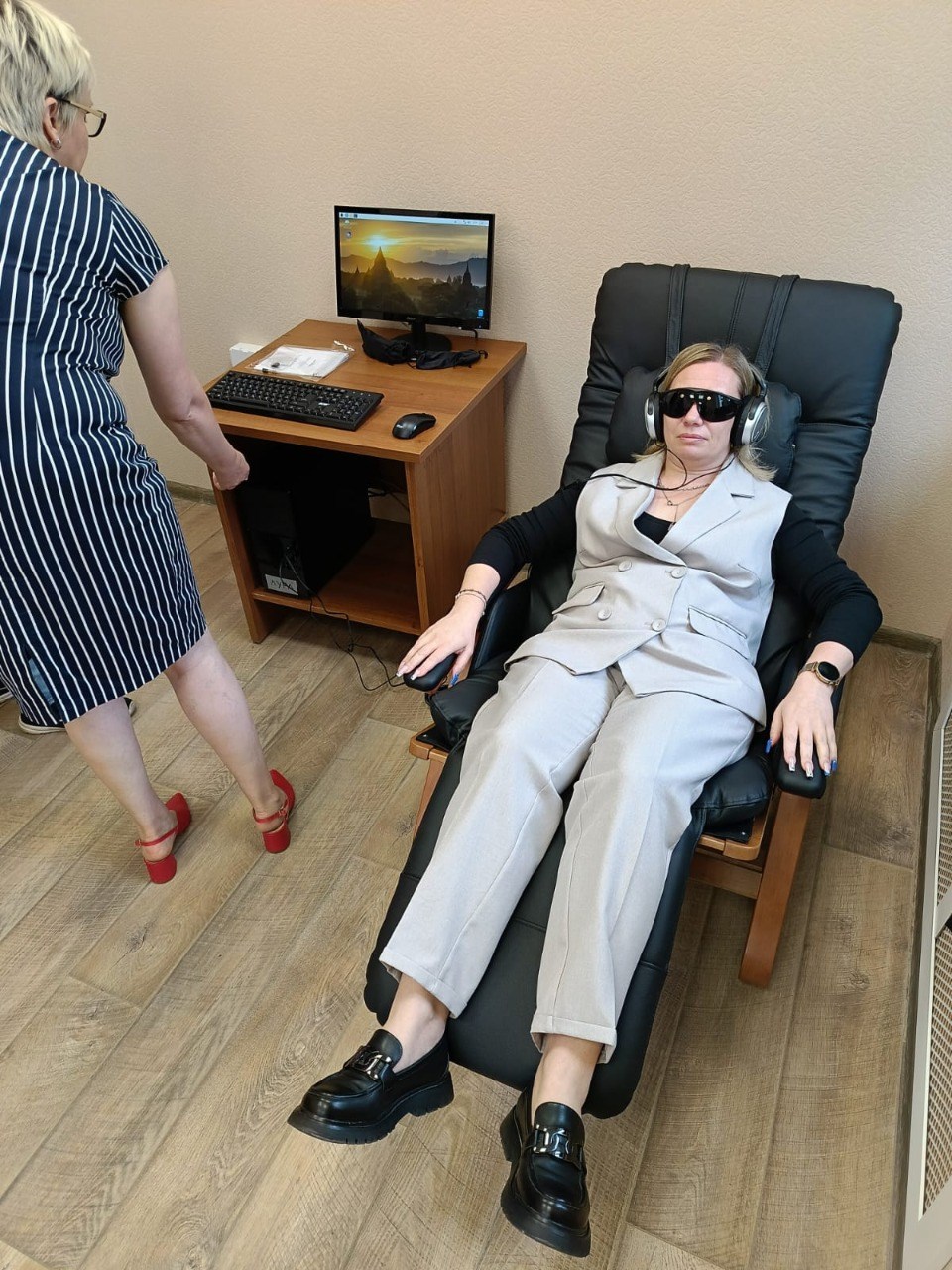 В результате многочисленных клинических исследований психофизиологическими компаниями в США и в России установлено, что при одновременной синхронной зрительной и слуховой стимуляции наряду с передачей через тело человека акустических волн низких частот (вибротактильная стимуляция) на фоне специально подобранных музыкальных произведений достигается эффект быстрого успокоения, а также глубокой мышечной и умственной релаксации. Запатентованная технология «VibraSound» посредством вибропреобразователей с помощью специального контроля импеданса позволяет вибрациям проникать в тело, обеспечивая захватывающую гамму переживаний, освобождающих человека от психоэмоционального напряжения, потенциирующих творческие возможности, восстанавливающих душевное равновесие. Вам будет достаточно 15-30 минут для восстановления психоэмоционального балланса и высокой работоспособности.