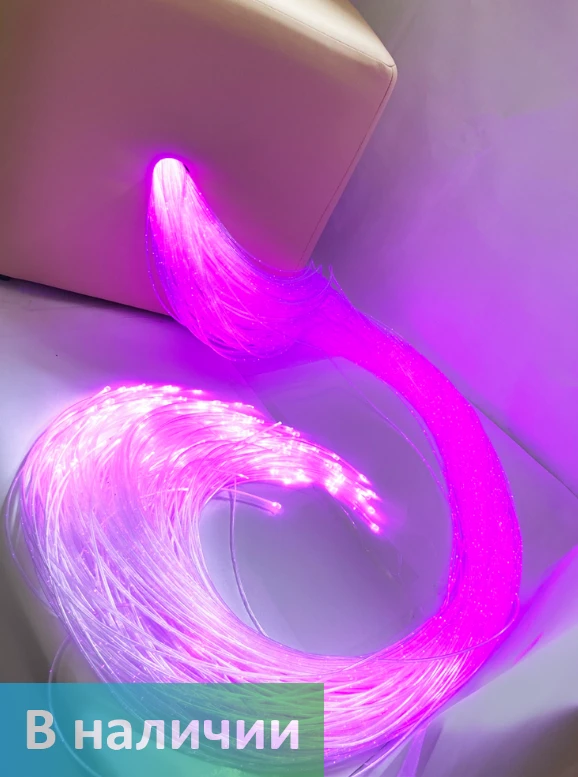 Пучок волокон с безопасным источником света содержит волокна с боковым свечением в местах, равномерно распределенных по длине волокон. Длина каждого волокна - 2 метра. . Каждое волокно в защитной силиконовой оболочке Все волокна собраны в общий кабель, торец которого подключен к интерактивному источнику света. Фиброоптический кабель совершенно безопасен при тактильных контактах, не боится воды и мороза.