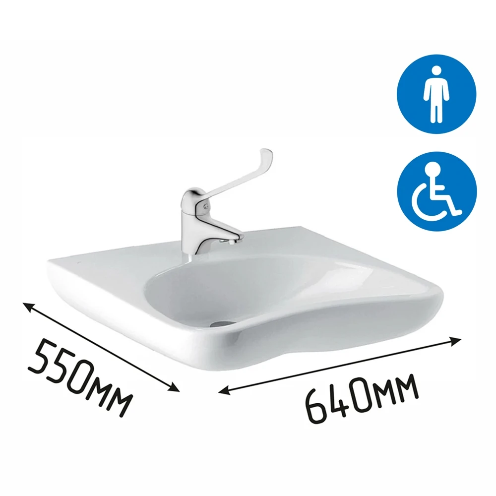 - К этой раковине отлично подойдут: Поручень для раковины двухопорный 600мм Ø 32, арт. 8071-600, Поручень для раковины прямой настенный 900мм Ø 32 мм, арт. 3218-900, Смеситель локтевой для санузла для инвалидов арт.2086A