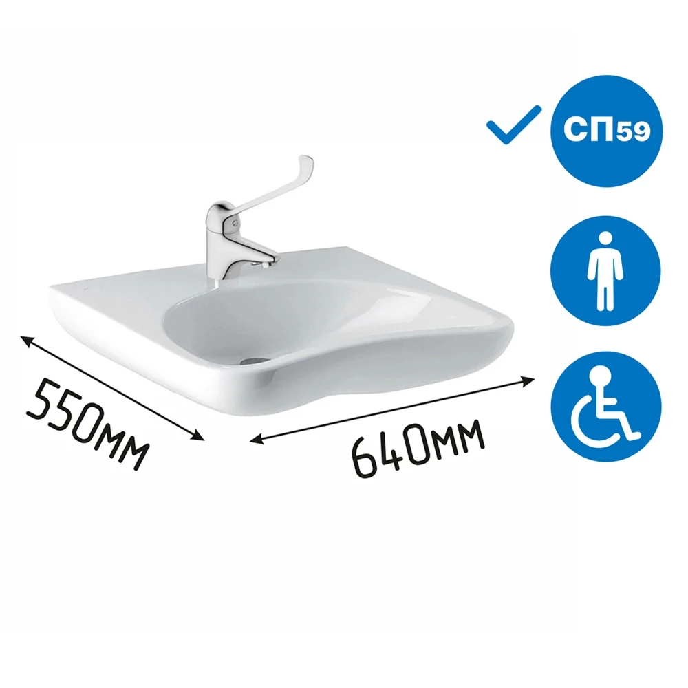 Раковина выполнена в эргономичном дизайне, с учётом физических особенностей МГН, с нарушением опорно-двигательного аппарата. Раковина имеет вогнутый травмобезопасный передний край, что обеспечивает беспрепятственное пользование смесителем людям в инвалидных креслах. Конструкция раковины оснащена широкими бортами, для мыльных принадлежностей.