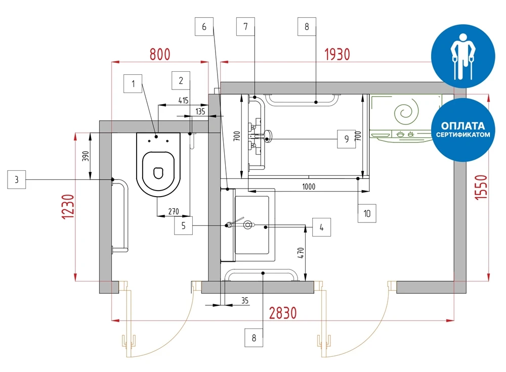 Оборудование подобрано в соответствии с нормами по доступной среде и с фокусом на эргономику движений человека на коляске в ограниченном пространстве квартирного санузла.