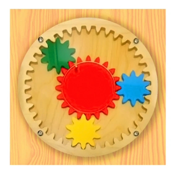 Панель изготовлена из высококачественной березовой фанеры. Состоит из одного ведущего зубчатого колеса и 3 сателлитов. Лицевая сторона изделия закрыта прозрачным оргстеклом. Позволяет не только развивать ловкость и моторику, но также изучать цвета.