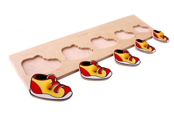 Деревянный планшет размером 37х10 см из серии «от большого к меньшему», на котором размещены 5 вкладышей в виде ботинок с ручками-кнопочками. Вкладыши уменьшаются в размерах от большего к меньшему в направлении слева направо. Логическая разборная доска-вкладыш помимо развития мелкой моторики поможет сформировать у малыша представления о величине и количестве, научит его осмысленно употреблять слова «большой», «маленький», «средний», «самый маленький», «самый большой», «больше чем», «меньше чем».