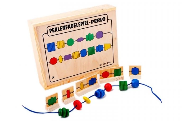 Шнуровка «Бусинка» состоит из 2 шнурков, 48 объемных фигур, различных по форме, цвету и размеру, (каждой по 2 штуки) с отверстиями для шнурка и 48 табличек на подставках с изображениями этих элементов, нанизанных на шнурки. В процессе игры можно складывать из табличек последовательность, а затем повторять ее, нанизывая фигурки на шнурок, называя при этом цвета фигурок. Для детей постарше можно усложнить задачу: предложите собрать специфический узор, чередуя синие и зелёные шайбы или красные и жёлтые. Когда бусы будут готовы, завяжите концы шнурка и дайте малышу просто перебирать фигурки пальчиками. Это отлично стимулирует развитие мелкой моторики.