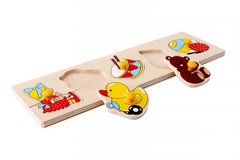 Доска-вкладыш представляет собой деревянную панель и 5 разных картинок, на которых изображены детские игрушки (кукла, цыпленок…), каждая из которых снабжена удобной ручкой. Пособие развивает и тренирует мелкую моторику, внимание, формирует элементарные счетные умения и пространственные ориентировки (слева, справа, в центре).