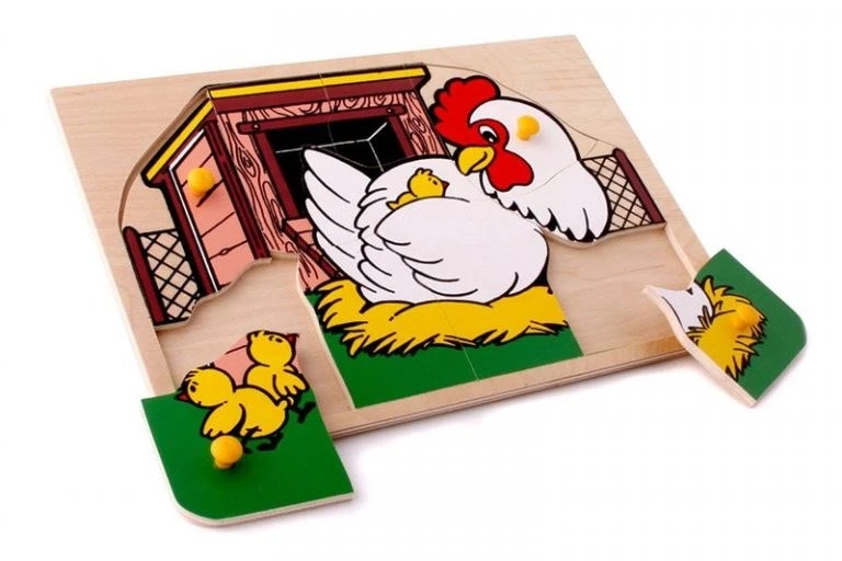 Вкладыш-головоломка размером 29,5х20,5 см, на котором изображена курица с цыпленком. На вкладышах головоломки имеются ручки-кнопочки. Открыв эти элементы, ребёнок должен их закрыть, подобрав нужную по размеру и рисунку часть.