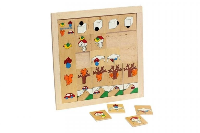 Данный игровой набор состоит из деревянного планшета 27х27 см и 16 карточек 5х5 см с изображениями различных предметов. На левой стороне планшета по вертикали изображены предметы, а сверху по горизонтали символами обозначены варианты расположения этих фигур в пространстве (на, под, за, впереди). В процессе игры ребенку необходимо расположить предмет в нужной графе в указанном стрелкой положении.