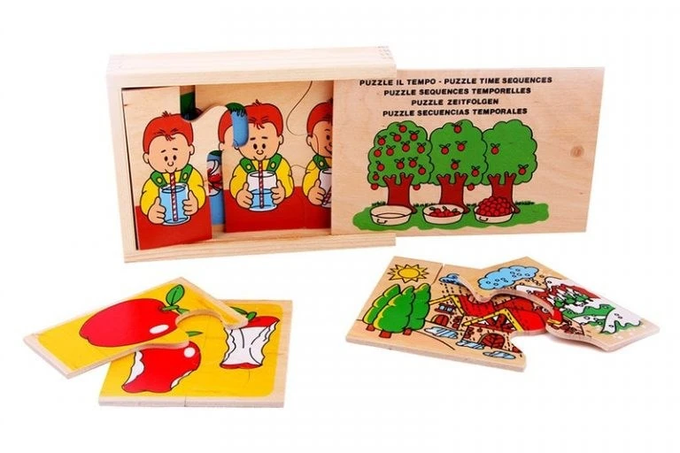 Пособие представляет 8 сборных фанерных картинок-табличек в картонной коробке. На каждой табличке изображен определенный процесс в его развитии от начала и до финала, картинка поделена волнистой линией-разрезом на 3 части – 3 основных этапа: начало, середина, конец. Например: 1) восход солнца, 2) солнце в зените, 3) закат. Всего в коробке 8 тем – картинок: яблоко, цветок, солнце, сезоны, свеча, карандаш, стакан с соком.