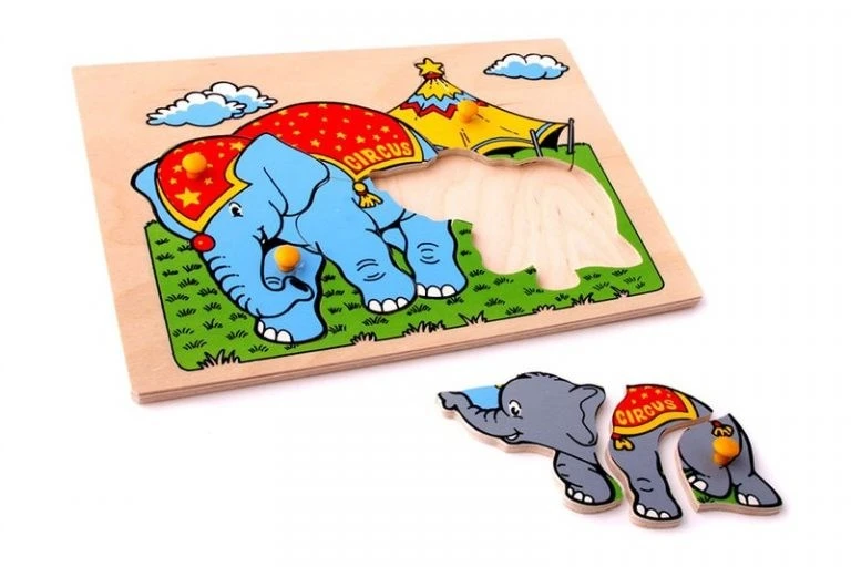 Вкладыш-головоломка размером 29,5х20,5 см, на котором изображена слон со слоненком. На вкладышах головоломки имеются ручки-кнопочки. Открыв эти элементы, ребёнок должен их закрыть, подобрав нужную по размеру и рисунку часть.