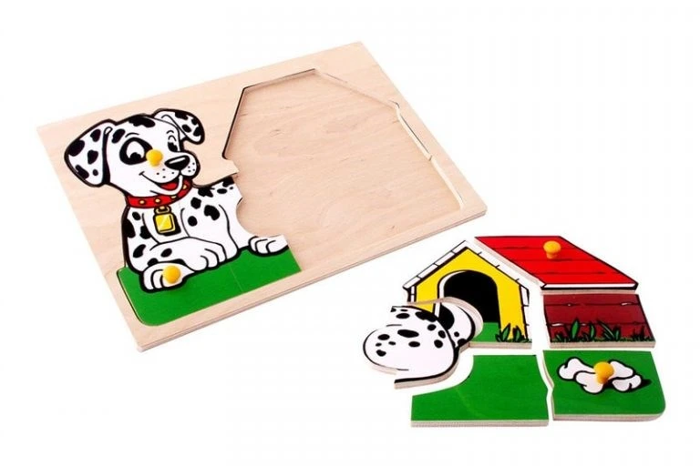 Вкладыш-головоломка размером 29,5х20,5 см, на котором изображена собачка рядом с будкой. На вкладышах головоломки имеются ручки-кнопочки. Открыв эти элементы, ребёнок должен их закрыть, подобрав нужную по размеру и рисунку часть.