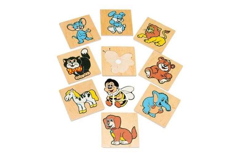 Игровое пособие представляет собой набор из 10 планшетов размером 14,5х14,5 см с вкладышами, на которых нарисованы любимые детьми животные. Детали вкладышей не имеют ручек-кнопочек. Трудность при сборке заключается в том, что детали нужно точно разместить в выемках на отдельных планшетах.