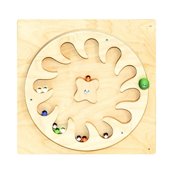 Развивающие тактильные панели "Лабиринт-цветок" и "Лабиринт-колесо" изготовлены из дерева (фанера, покрытая лаком). Шарики скрыты под прозрачным акриловым стеклом. В лабиринте "Цветок" при вращении шарики разлетаются внутри диска в разные стороны.