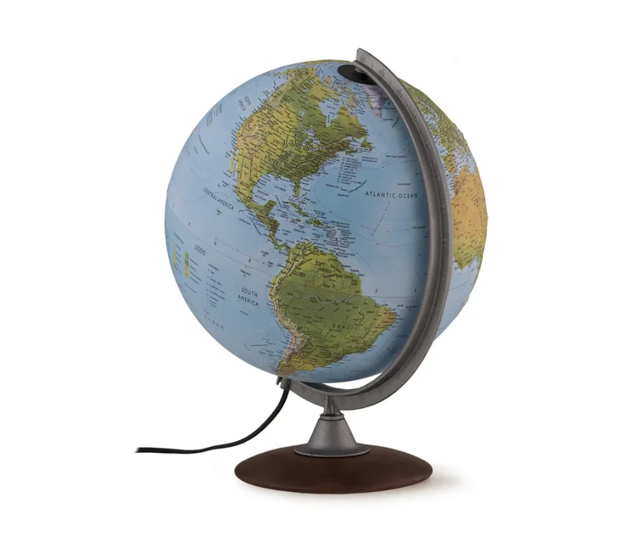 Рельефный глобус на деревянной подставке, с двойной картой. При выключенной подсветке - это глобус с физической картой мира, при включении подсветки проявляется политическая карта мира.