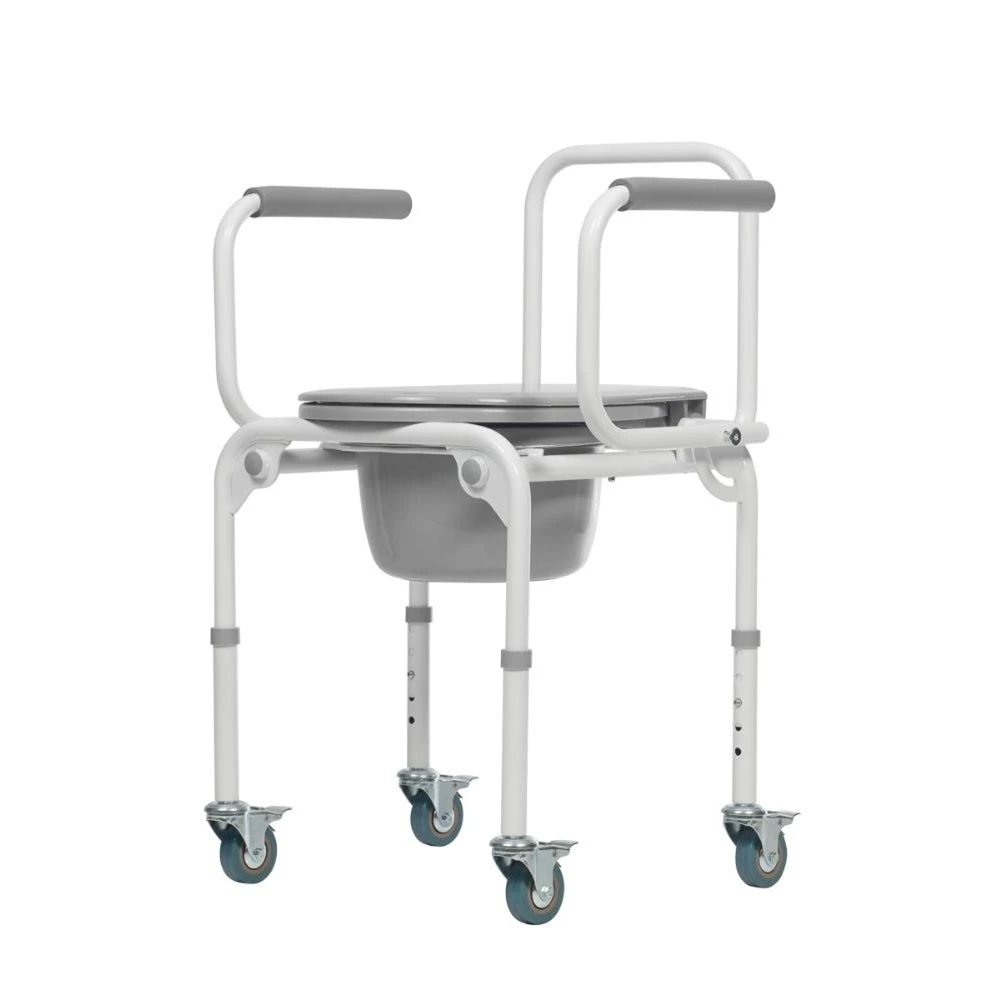 Кресло инвалидное с санитарным оснащением по ТУ 9452-002-66445146-2016 ТУ 80 оснащено цельнолитыми колесами, с помощью которых стул удобно перемещать при помощи сопровождающего лица. Для безопасной остановки стула предусмотрены 4 стояночных тормоза.