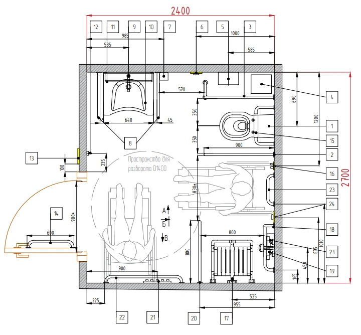 Санузел с душем для инвалидов, центральное расположение унитаза 2,7 х 2,4 м, комплект оборудования с подвесным унитазом и DWG проектом