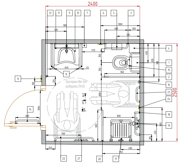 В соответствии с действующими нормами СП 59.13330.2020 санузел должен быть адаптирован для инвалидов специализированным оборудованием (все необходимое учтено в наборе!).