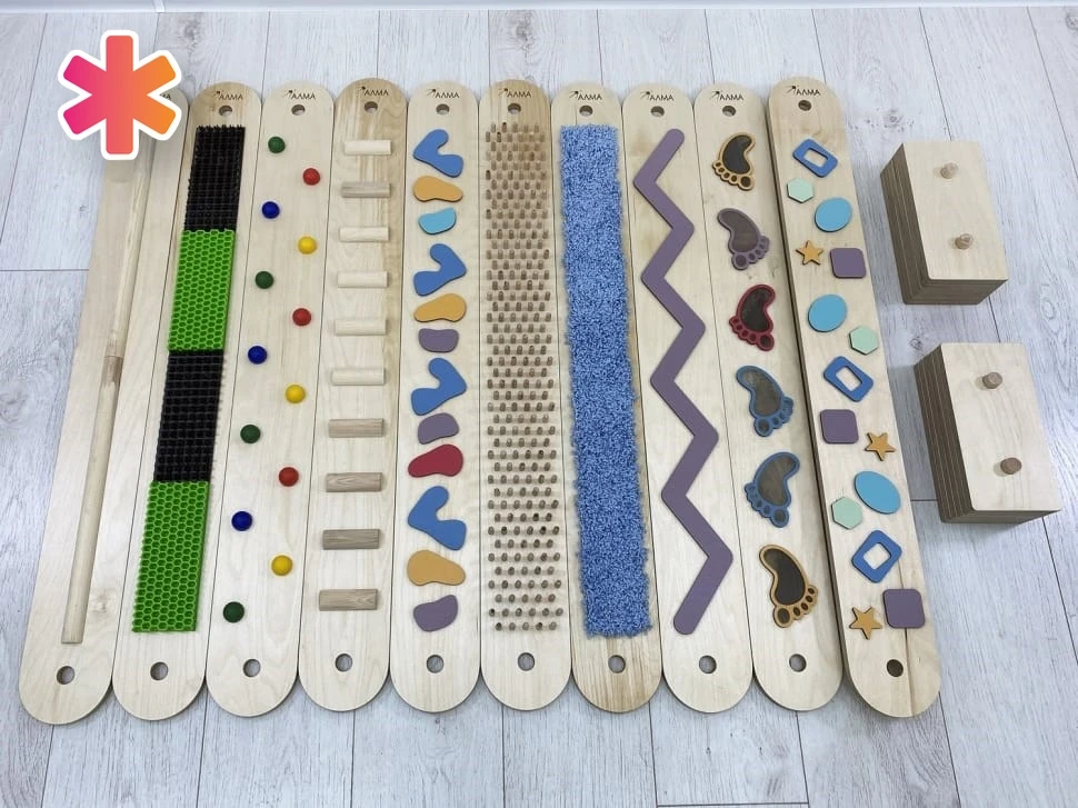 Игровое оборудование для развития равновесия и массажа ступней у детей. Состоит из 10 троп и 10 брусков-оснований + 2 стартовых бруска. Из них можно построить дорожку различной конфигурации с поворотами под разными углами, чтобы детям каждый раз было не скучно заниматься.